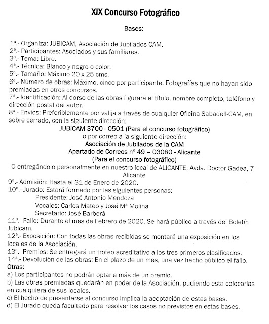 Recordamos a los asociados y amigos de Jubicam que , hasta el 31 de enero de 2020, se pueden enviar las fotografías correspondientes al XIX Concurso Fotográfico, cuyas bases publicamos seguidamente.